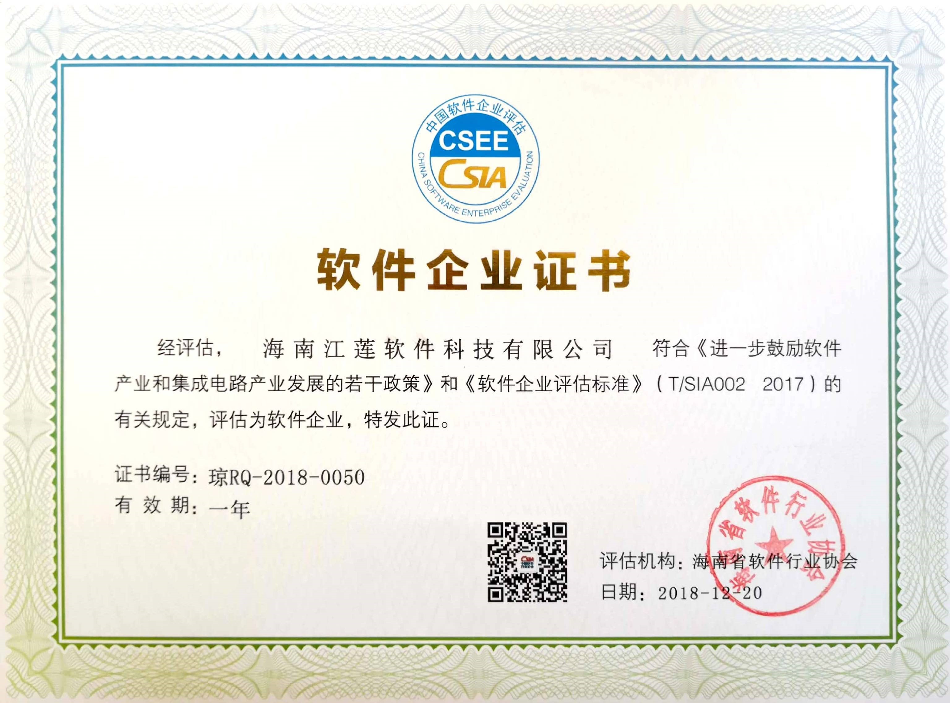 2018年12月,经中国软件企业评估联盟、海南省省软件行业协会审核,海南江莲软件科技有限公司被评估为软件企业,颁发了《软件企业证书》。